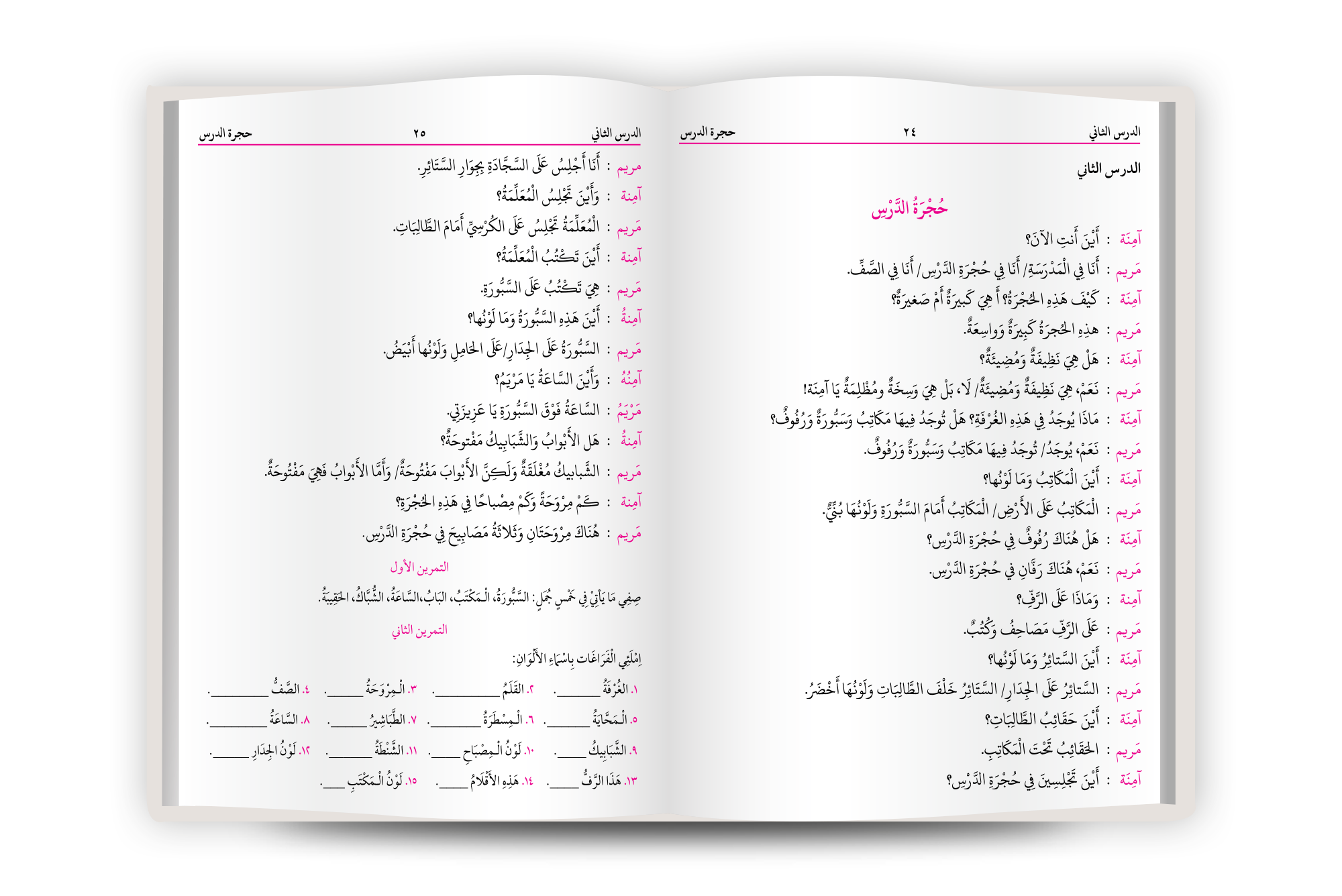 ہر درس کے بعد مختلف نوعیتوں کی تمارین کا اندراج، جیسے: عربی کلمات اور جملے لکھنا اور پڑھنا، خالی جگہ پُر کرنا، لکیر کھینچ کر جملے ملانا، تصاویر میں رنگ بھرنا، عربی جملے بنانا، سوالات کے جوابات لکھنا، جملوں میں غلطی کی نشاندہی کرنا اور مکالمہ کرنا وغیرہ۔